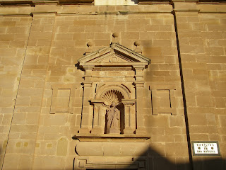 Entre unas pilastras toscanas decorativas bajo un frontón triangular, sobre el dintel de la portada de acceso y en una hornacina, se encuentra el obispo titular de esta Basílica, San Marcial. Tiene una pequeña espadaña para un campanillo.